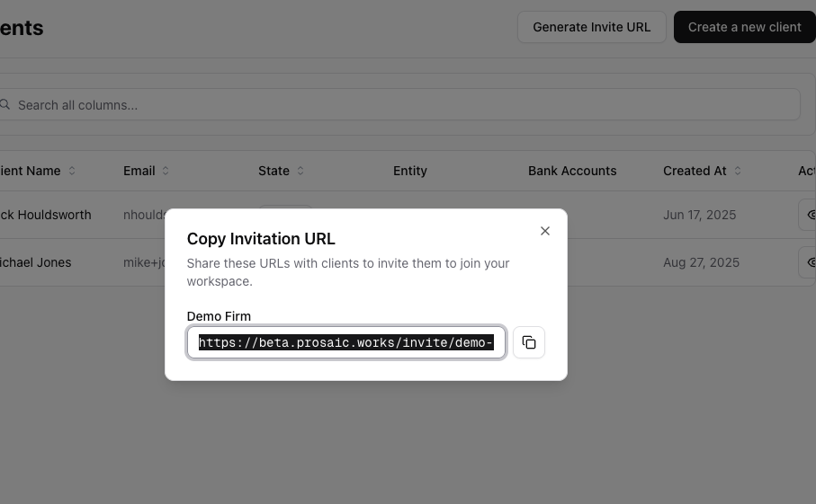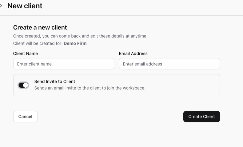 When creating a new client, you’ll see the option to send an invitation. This automatically emails the client a link to their onboarding flow, where they will: