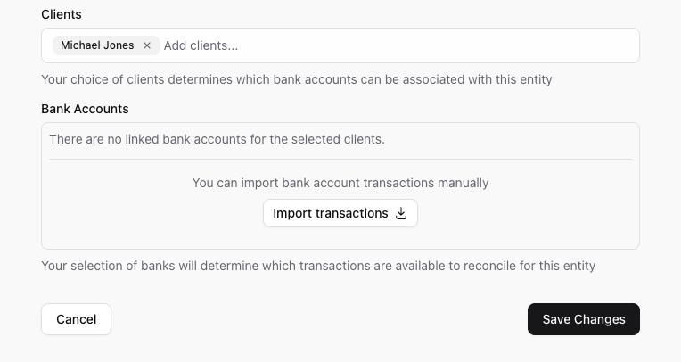 Within Prosaic, every bank account is linked to a client. You can either manually import bank statements for that client, or you can invite them to connect live bank feeds. Once a bank account is set up, you can assign it to an entity and begin reconciling transactions and preparing tax returns.