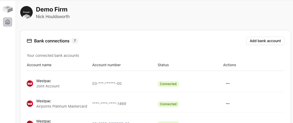 - Choose 'Add Bank Accounts' and follow the prompts to sign into Akahu and enable bank account access for Prosaic