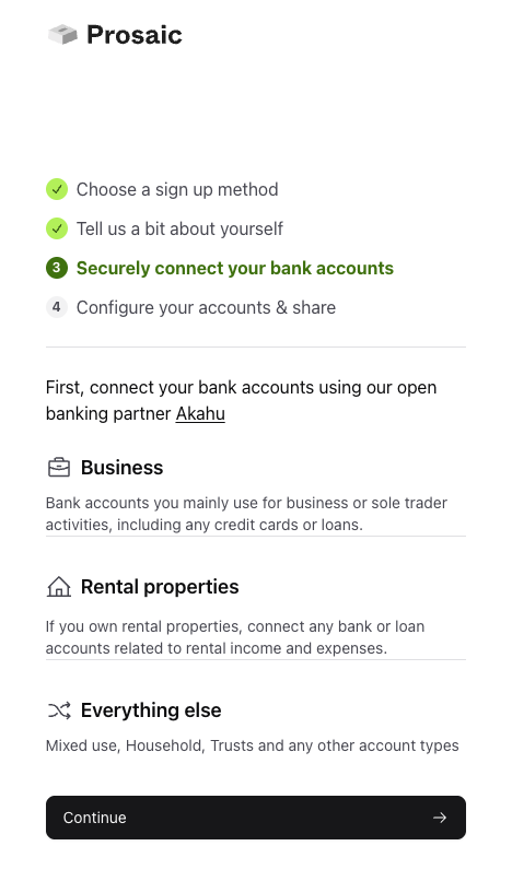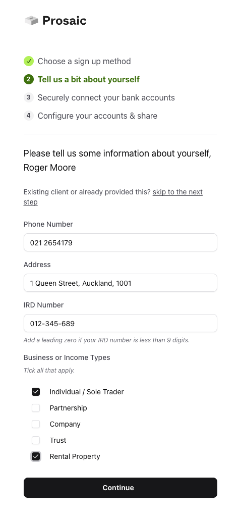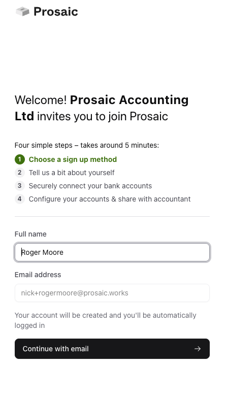 When you invite a client to join Prosaic, they’re guided through a short onboarding flow that takes about five minutes. Here’s what they’ll be asked to provide.