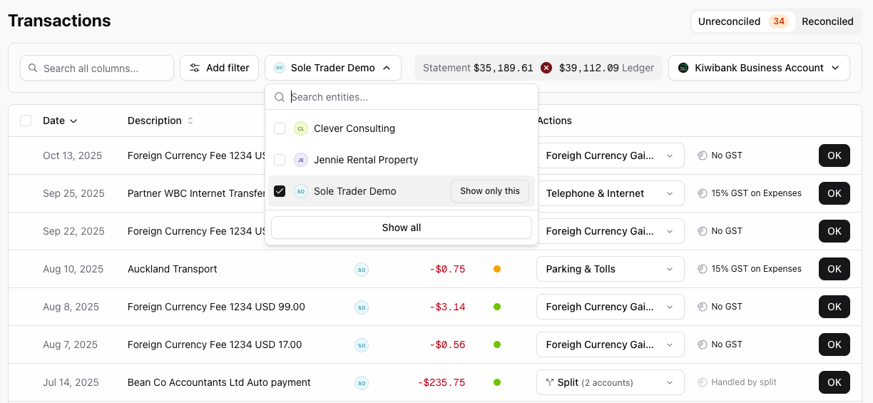 - New entity and bank account filters persist across all transaction views, making it easy to toggle between clients, focus on a single client, or reconcile groups of clients together