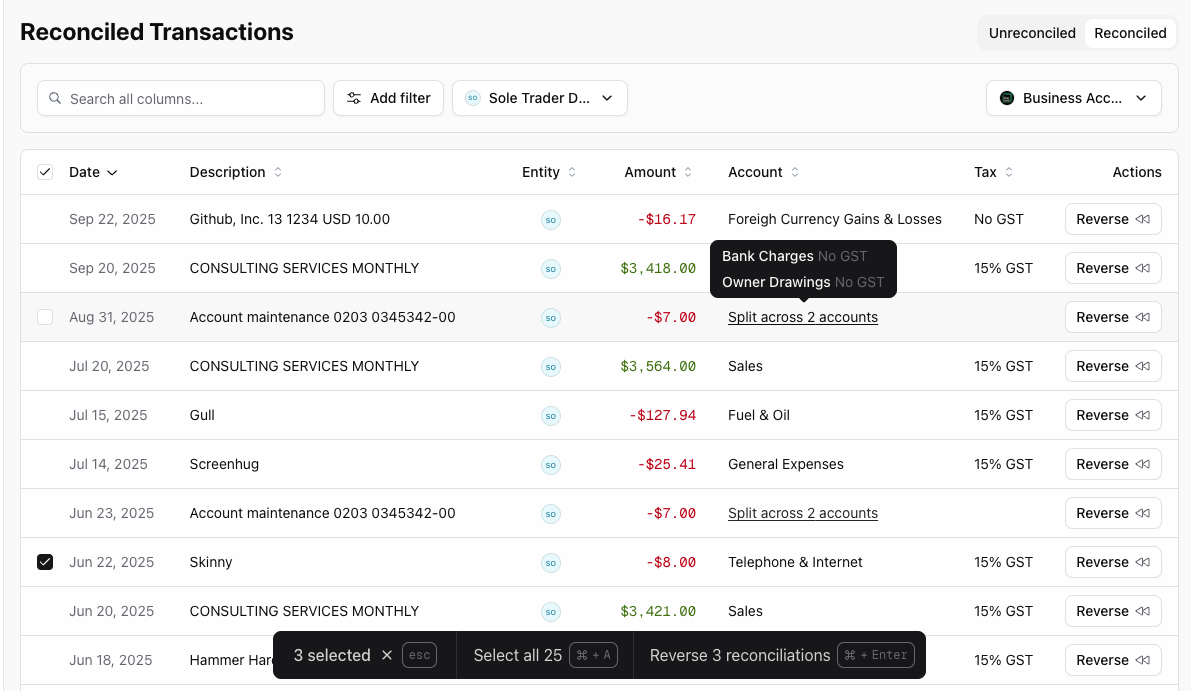 - Bulk-reverse reconciled transactions with a reason prompt and undo option