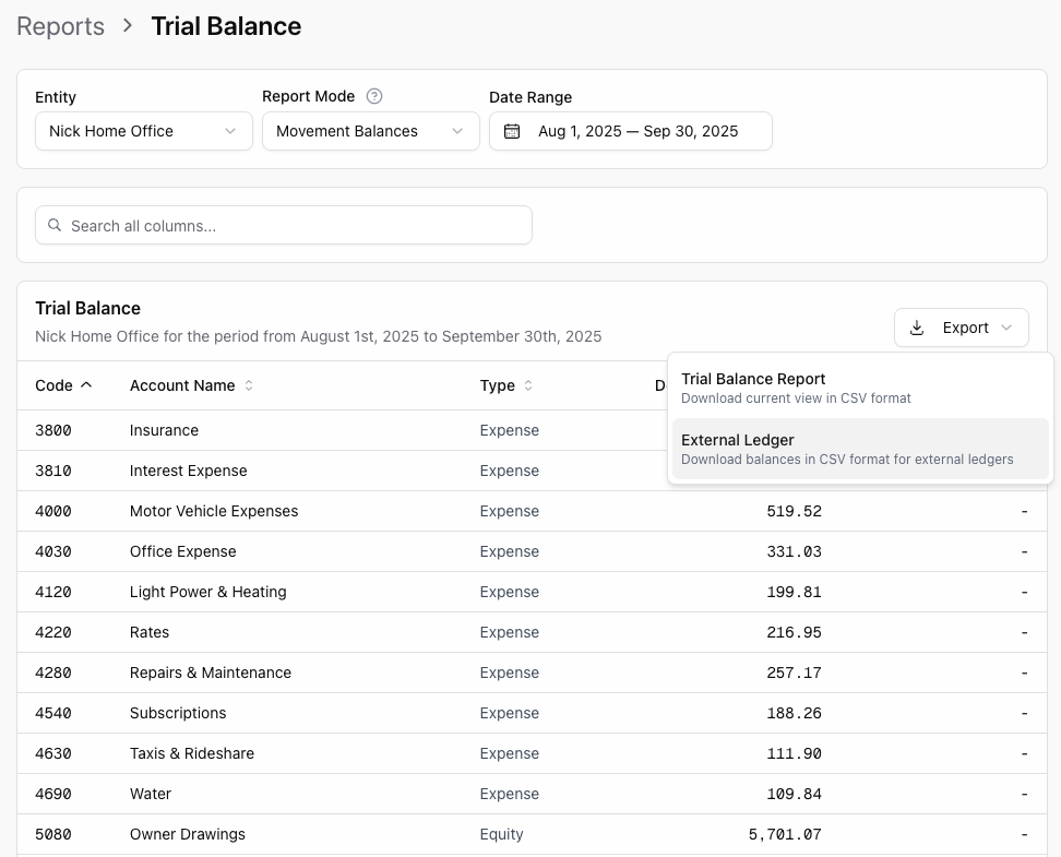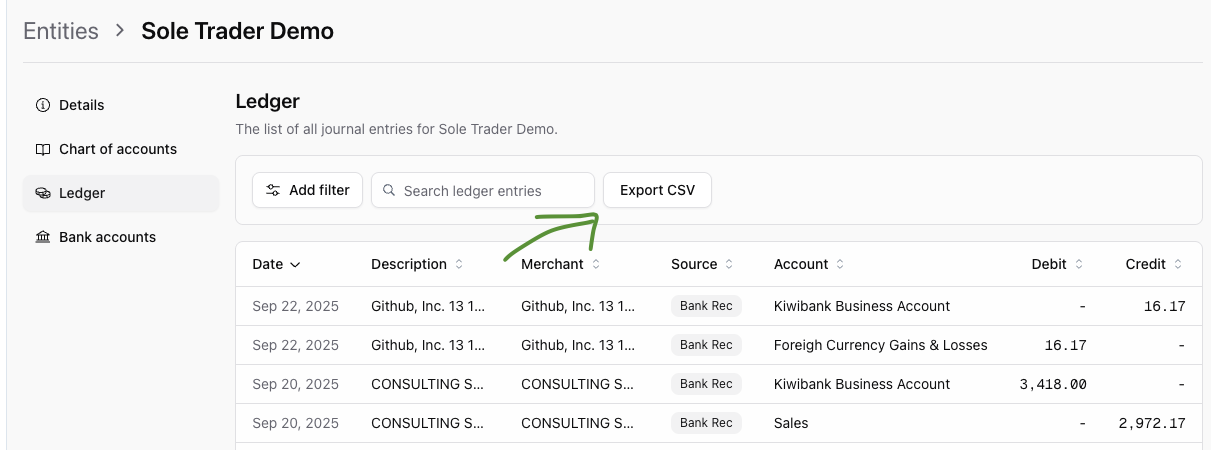- Entity ledger exports are now available in CSV format for sharing or export to external tax, reporting or excel - full export of filtered by date and account