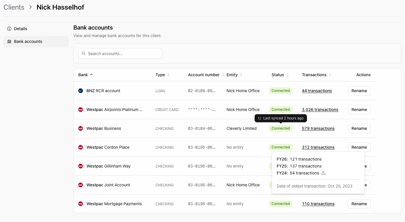 - Click a clientโs name to view more details, including connected bank accounts and last-synced status