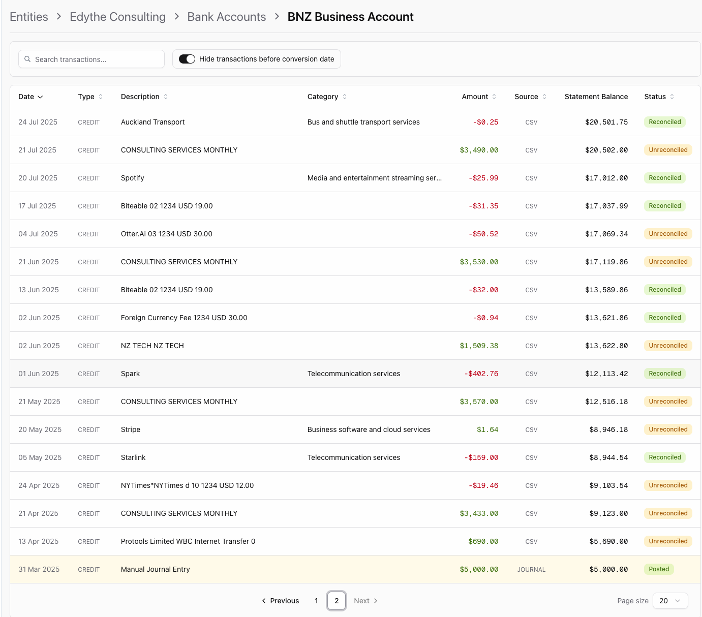 When setting up a new entity in Prosaic, it’s important to understand how opening balances, conversion dates, and statement balances work together. These determine how your bank data appears and how balances are calculated within the system.