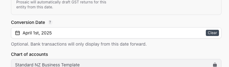 The conversion date tells Prosaic when to begin showing and calculating transactions for an entity.