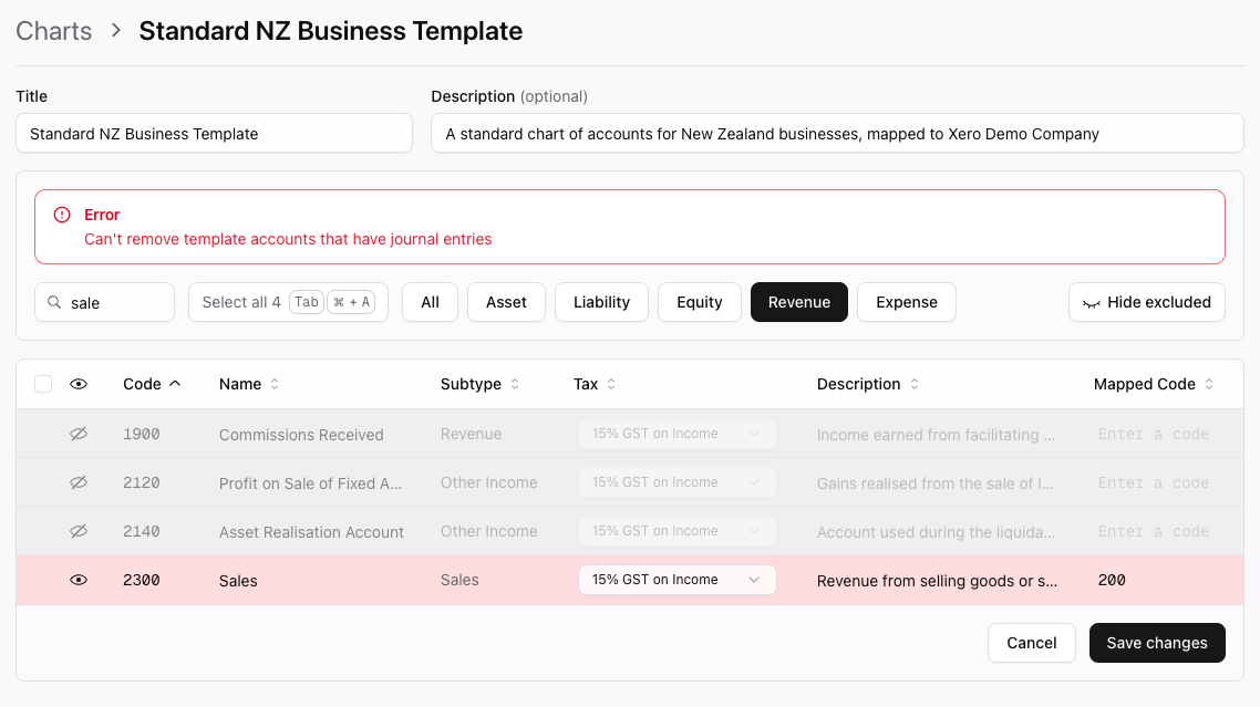 You can always add new master codes and subcodes to a template, but if a template is used by entities and those accounts have already had journals posted to them, you cannot delete those accounts in the template. In future we will support archiving and/or migrating entity accounts if you need to delete template accounts in use, but for now this is not possible.