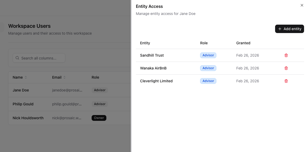 This guide explains how user roles and client access work, and how to control who can see and manage each client (entity) in your workspace.